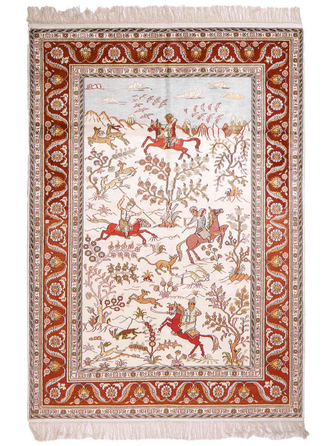 Tento koberec je vyroben z vysoce kvalitního čistého hedvábí – materiálu, který je již po staletí ceněn pro svou jemnost, lesk a luxusní vzhled. Jemná hedvábná vlákna umožňují vytvořit obzvláště detailní vzory a filigránské ornamenty, které tomuto koberci dodávají jeho mimořádnou expresivitu. Hedvábí přirozeně odráží světlo a zajišťuje tak živé barevné odstíny a ušlechtilý, lesklý povrch. Zároveň je vlas příjemně měkký a poddajný – smyslný zážitek pro oči i nohy. Hedvábný koberec je více než jen bytový doplněk: představuje nejvyšší řemeslné umění, smysl pro styl a nadčasovou krásu. S tímto kobercem dáte jasně najevo eleganci a kvalitu ve svém domově.