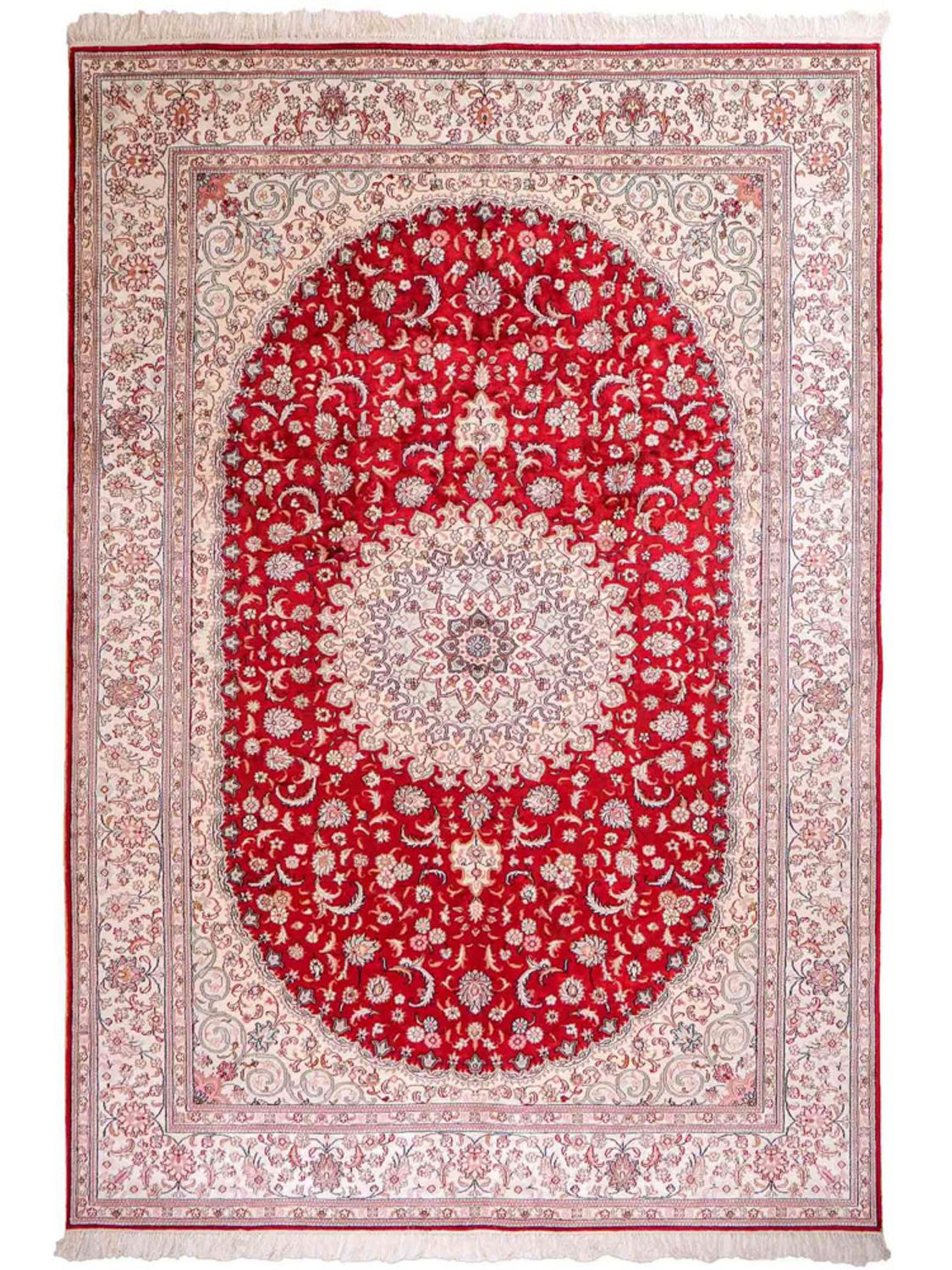 Tento koberec je vyroben z vysoce kvalitního čistého hedvábí – materiálu, který je již po staletí ceněn pro svou jemnost, lesk a luxusní vzhled. Jemná hedvábná vlákna umožňují vytvořit obzvláště detailní vzory a filigránské ornamenty, které tomuto koberci dodávají jeho mimořádnou expresivitu. Hedvábí přirozeně odráží světlo a zajišťuje tak živé barevné odstíny a ušlechtilý, lesklý povrch. Zároveň je vlas příjemně měkký a poddajný – smyslný zážitek pro oči i nohy. Hedvábný koberec je více než jen bytový doplněk: představuje nejvyšší řemeslné umění, smysl pro styl a nadčasovou krásu. S tímto kobercem dáte jasně najevo eleganci a kvalitu ve svém domově.