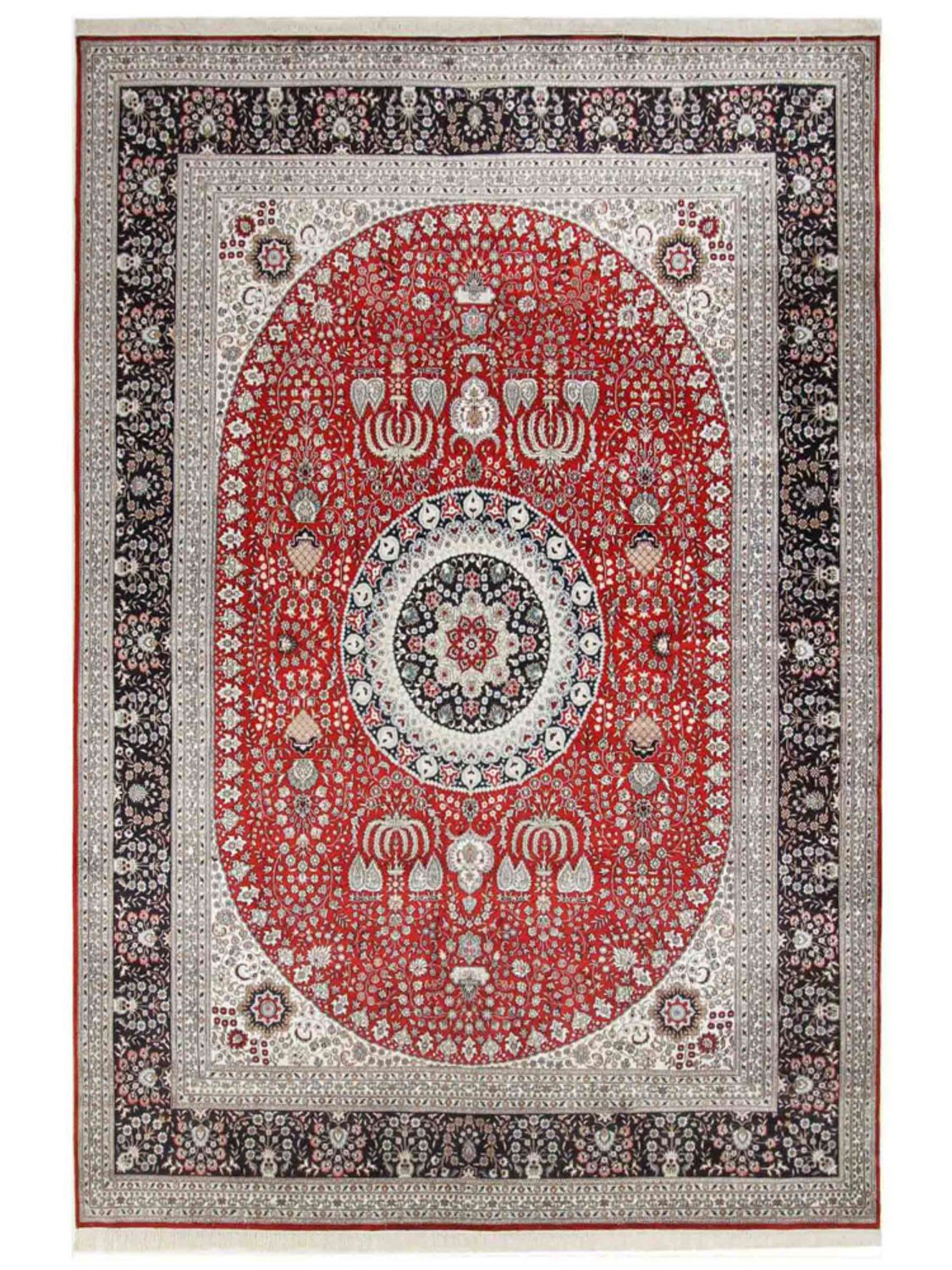 Tento koberec je vyroben z vysoce kvalitního čistého hedvábí – materiálu, který je již po staletí ceněn pro svou jemnost, lesk a luxusní vzhled. Jemná hedvábná vlákna umožňují vytvořit obzvláště detailní vzory a filigránské ornamenty, které tomuto koberci dodávají jeho mimořádnou expresivitu. Hedvábí přirozeně odráží světlo a zajišťuje tak živé barevné odstíny a ušlechtilý, lesklý povrch. Zároveň je vlas příjemně měkký a poddajný – smyslný zážitek pro oči i nohy. Hedvábný koberec je více než jen bytový doplněk: představuje nejvyšší řemeslné umění, smysl pro styl a nadčasovou krásu. S tímto kobercem dáte jasně najevo eleganci a kvalitu ve svém domově.