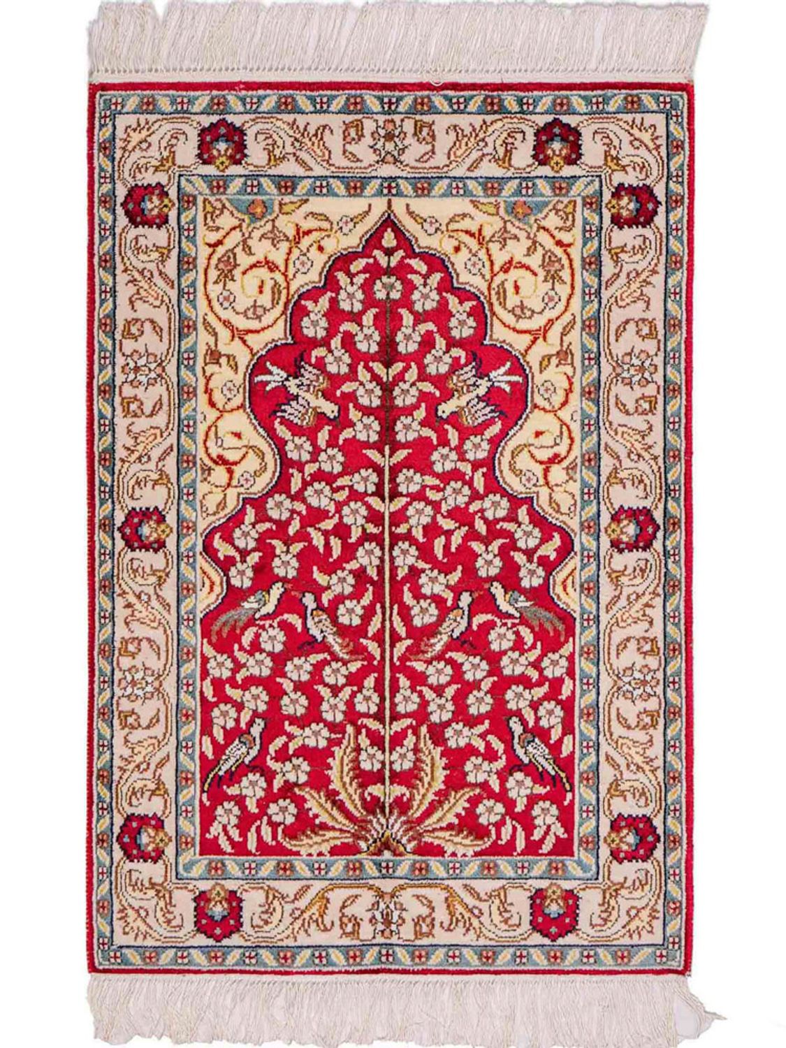 Tento koberec je vyroben z vysoce kvalitního čistého hedvábí – materiálu, který je již po staletí ceněn pro svou jemnost, lesk a luxusní vzhled. Jemná hedvábná vlákna umožňují vytvořit obzvláště detailní vzory a filigránské ornamenty, které tomuto koberci dodávají jeho mimořádnou expresivitu. Hedvábí přirozeně odráží světlo a zajišťuje tak živé barevné odstíny a ušlechtilý, lesklý povrch. Zároveň je vlas příjemně měkký a poddajný – smyslný zážitek pro oči i nohy. Hedvábný koberec je více než jen bytový doplněk: představuje nejvyšší řemeslné umění, smysl pro styl a nadčasovou krásu. S tímto kobercem dáte jasně najevo eleganci a kvalitu ve svém domově.