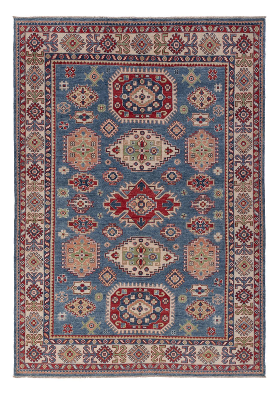 Tento koberec Ziegler - Kazak vnese do vašeho domova závan čerstvého vzduchu! Uzlíková oblast Kazak se nachází na Kavkaze. Vzor je inspirován geometrickými vzory z Ruska a vlna je barvena přírodními rostlinnými barvivy. Koberce jsou odolné a mají výrazné barvy. Po zauzlování se perou s kameny, aby se dosáhlo zvláštního lesklého charakteru. Dnešní kazašské koberce jsou téměř vždy koberce, které byly vázány v Pákistánu nebo Afghánistánu a jejichž vzory vycházejí ze starých vzorů celé kavkazské oblasti.