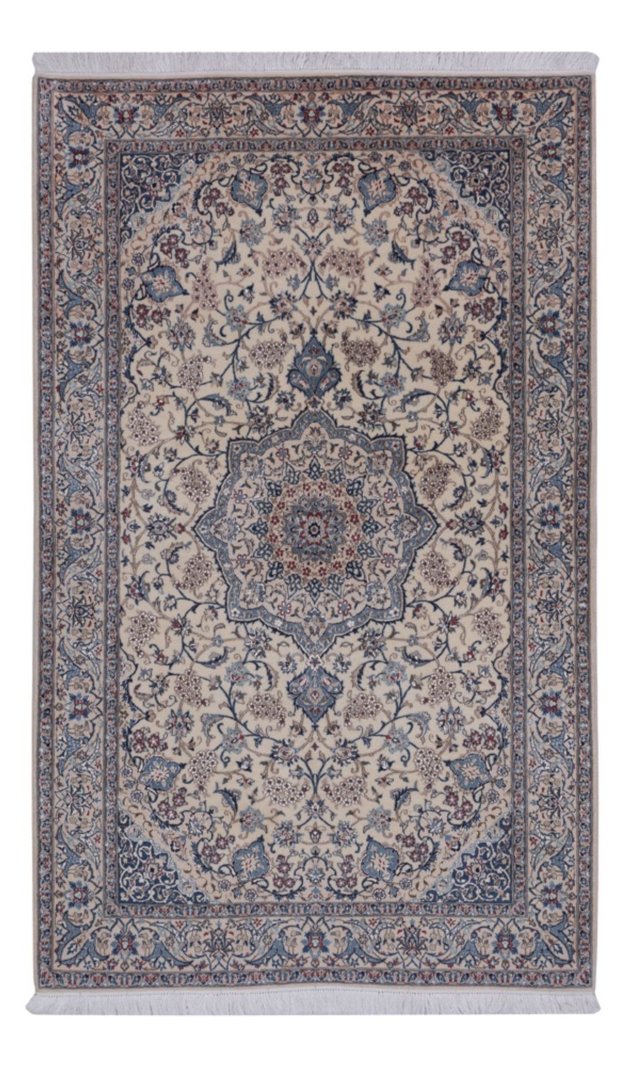 Tento krásný a vzácně jemně vázaný perský koberec - Nain - Premium patří do nejvyššího stupně kvality 4 s přibližně 890 000 až 1 000 000 uzly na metr čtvereční. Jemný koberec Nain 6La vděčí za svůj věhlas svému původu. V celém Orientu je považován za mimořádně kvalitní perský koberec. Koberce Nain jsou vázány s mimořádnou jemností. Jako materiál vlasu se obvykle používá nejlepší sametová korková vlna a vždy se používá hedvábí, aby bylo možné provést přesný vzor medailonů a celoplošných vzorů. Nain se dělí na 4 kvalitativní stupně, které jsou označeny písmenem "La". 4La, 6La, 9La, 12La. Jedná se o označení kvality a odkazuje na počet vrstev nití obsažených v každé osnovní niti. Čím nižší je uvedené číslo, tím je koberec jemnější a hustší. Nainy patří k nejkrásnějším na světě. Mezi sběrateli jsou velmi oblíbené. Díky své jednoduché eleganci se Nainy hodí i do moderních interiérů.