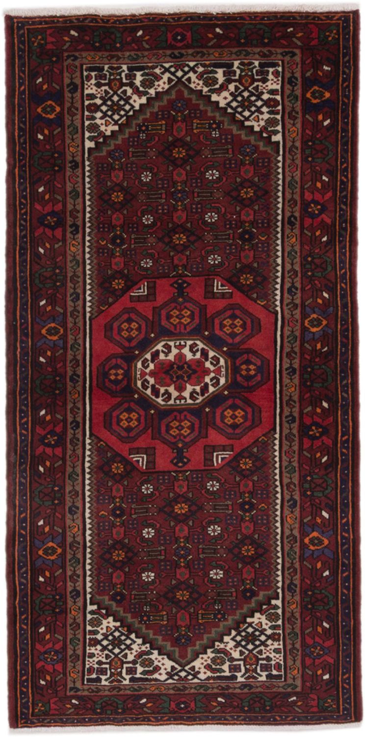 Hamedan - Okouzlující krása, mimořádně robustní. Tento koberec Hamedan je té nejlepší kvality/dobré jakosti. Rustikální kouzlo, teplé přírodní tóny v indigově modré a červené barvě a zvláštní odolnost charakterizují koberec Hamedan. Ručně předená íránská vysokohorská vlna mu dodává jemný lesk. Robustní povrch zajišťuje "turecký uzel". Hamedány jsou považovány za nejjednodušší perské koberce. Jsou tradičně ručně vázané ve vesnicích v okolí íránského města Hamedan. Každý koberec je nápaditým individuálním dílem. Svědčí o tom drobné nepravidelnosti ve vzoru. Hamedány jsou krásné užitkové koberce s atraktivním poměrem cena/výkon.