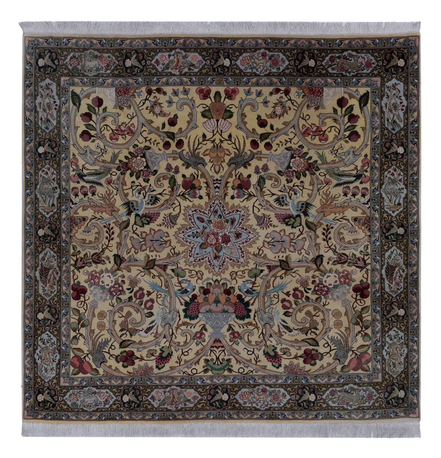 Tento jemně vázaný perský koberec - Tabriz - Royal je vyroben z vysoce kvalitní korkové vlny, pečlivou a bezchybnou ruční prací. Koberec Tabriz 40 Raj patří k nejkrásnějším ve své třídě. Tento koberec založil dobrou pověst perského uzlařského umění. Jedná se o velmi oblíbený koberec z jedné z nejlepších uzlařských oblastí v Persii. Často mají velký, centrálně umístěný medailon s krásnými květinovými motivy, typickým orientálním motivem. Tabrízské koberce mají často doplňkové označení Rádž. Rozlišuje se mezi 40, 50, 60, 70 a 80 ráji. Čím vyšší číslo, tím je koberec jemnější a hustěji vázaný. Rádž je označení kvality a označuje počet uzlů na šířce přibližně 70 mm. Díky hustému uzlíku je koberec odolný, necitlivý a hodí se i pro extrémní použití. Klasická elegance a barevná bohatost charakterizují tento ušlechtilý koberec.
